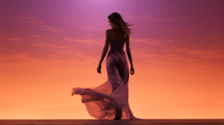 A model wearing an elegant evening gown, standing against a minimalist backdrop, highlighting the dresss flowing silhouette.