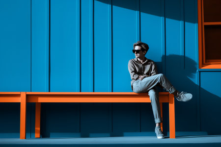 a person sitting on an orange bench in front of a blue wall