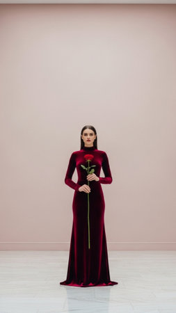 A striking vertical full body portrait for Valentine's Day. A sophisticated young woman in a floor-l