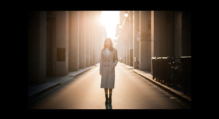 A woman in a beige coat stands in the middle of a city street, surrounded by tall buildings and sunlight shining down, creating a serene and contemplative atmosphere.