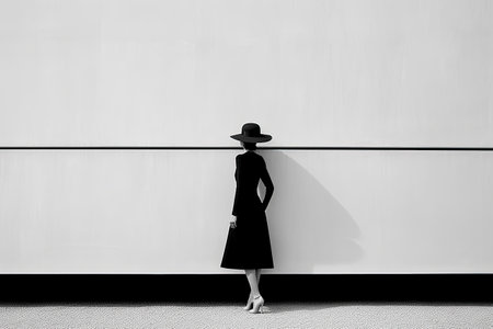Stylish female figure in a black dress and large hat poses in a softly lit interior, exuding elegance and charm in a serene and artistic environment