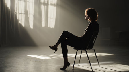 A dramatic silhouette of a woman seated on a chair in a minimalist studio, illuminated by soft sunlight for a striking effect.