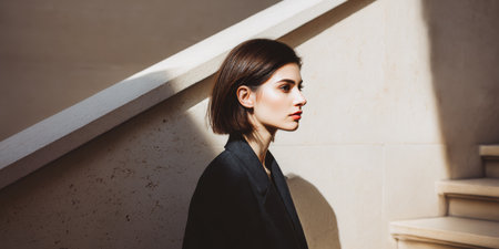 A woman stands on a staircase with light and shadow playing on her face. She is wearing a dark outfit and appears to be deep in thought. The location has clean lines and a modern design.