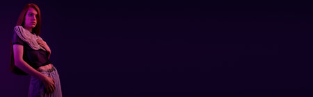 brunette asian woman in trendy suit standing with hands on hips on white, banner