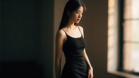 Portrait of beautiful young asian woman in black dress indoors.