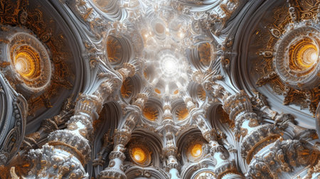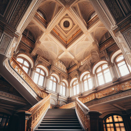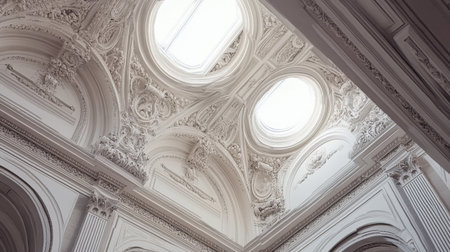 Captivating view of a grand interior showcasing intricate architectural details, ornate moldings, and elegant skylights that enhance the beauty of the space with natural light.