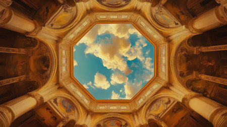 A stunning view of an octagonal ceiling captured beneath a bright blue sky filled with fluffy clouds. This architectural masterpiece showcases intricate designs and symbolizes elegance and artistry, creating an inviting atmosphere.