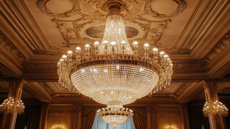 A luxurious chandelier hangs from the ceiling of a well-lit room, adding a touch of sophistication to the space, A ceiling adorned with ornate chandeliers and intricate moldings