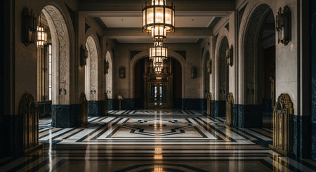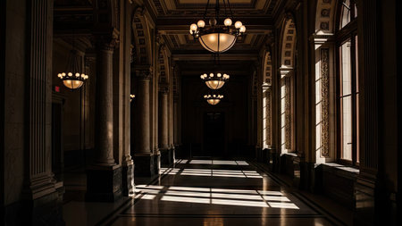 An interior shot showcases a long hallway featuring pillars, archways, and ornate chandeliers. Warm sunlight streams through tall windows, casting shadows across the polished floor. The scene evokes a sense of grandeur and historical architecture, suitable for commercial or editorial applications.