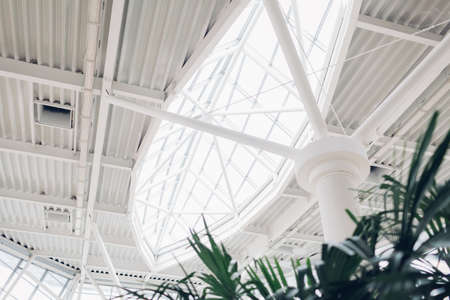 Modern buildings. Shopping center interior design. High tech architecture with nature indoors. Transparent roof with window on column.