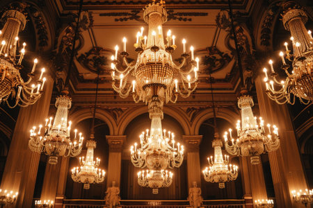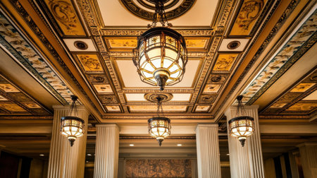 A captivating view of an ornate vintage ceiling adorned with elegant chandeliers, showcasing intricate details that exemplify luxurious interior design and classic architectural beauty.