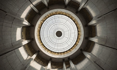 Stunning view of an architectural dome with intricate glasswork, where sunlight filters through, creating a serene atmosphere and emphasizing structural beauty.