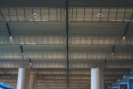 Modern business building background with sunlight from outside. Huge glass window and nice wooden plank pattern ceiling roof structure backgrounds. Modern construction, luxury hall interior design.
