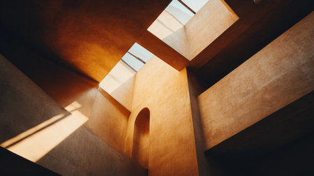 A captivating modern interior showcasing textured walls and geometric shapes, bathed in natural light through skylights, creating a warm and inviting atmosphere.