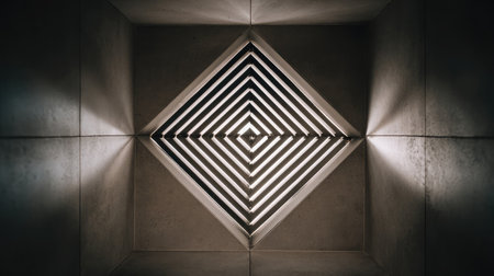 This artistic perspective captures a modern ventilation grille in a minimalist interior, highlighting geometric patterns and the interplay of light and shadow.