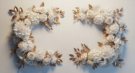 Fresh flowers and lush greenery create a beautiful arrangement along the edges of a neutral background, perfect for events or artistic displays.