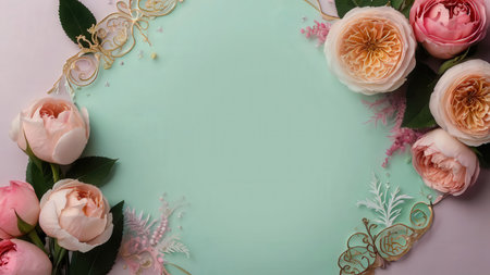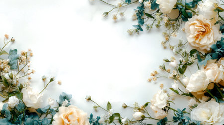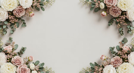 A decorative border crafted with various roses and branches frames a light, neutral surface. This natural setup offers a view for artistic presentations or invitations.