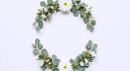 Flowers composition. Frame made of eucalyptus branches, white flowers and green leaves on white background. Flat lay, top view, copy space