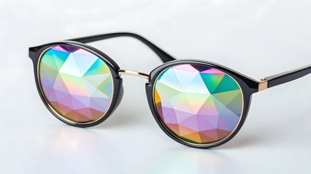 Stylish geometric sunglasses showcase vibrant rainbow lens reflections in daylight.