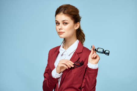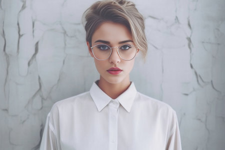 Confident businesswoman Confident young businesswoman adjusting her eyewear and looking at camera while standing against grey background : Generative AI