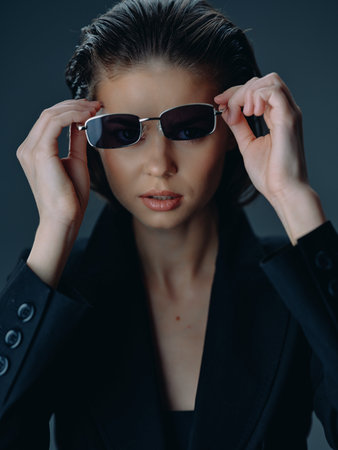 Stylish woman adjusting sunglasses wearing black blazer with wet hair in moody lighting