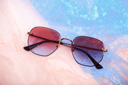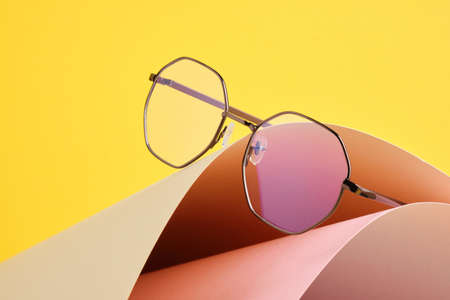 fashion trendy eyes glasses for correcting vision on a creative background, wave from paper, colorful background, copy space