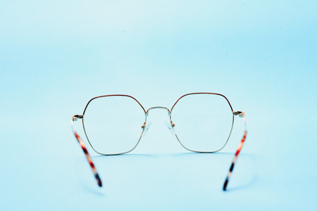 Classic eyeglasses on pink-blue background. Top view. Minimalism