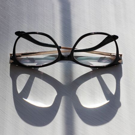 Beautiful trendy black round reading glasses on white wooden background and lens projection and reflection on the table. A hard shadow .Trend. Concept of blogging and development