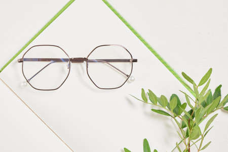 trendy modern glasses notepad and branch with small green leaves on light background copy space, summer and spring mood concept top view