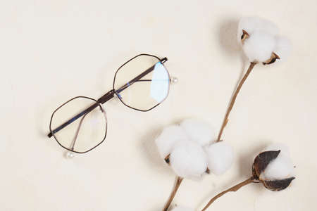 fashionable glasses and cotton flowers on a beige background copy space top view