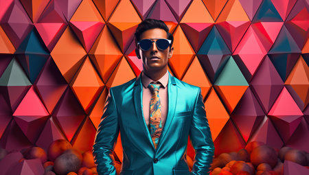 An adult man in dark sunglasses and a bright turquoise suit with a brightly patterned shirt against a colorful geometric wall and fruits.