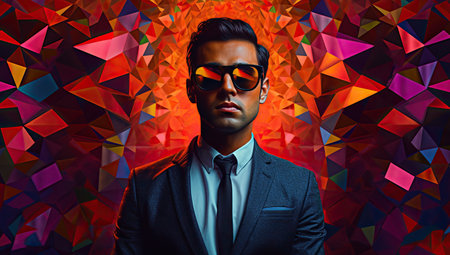 An adult man with dark hair wearing glasses and a blue suit against a colorful geometric mosaic background.
