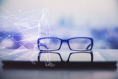 Business theme hologram with glasses on the table background. Concept of search. Double exposure.