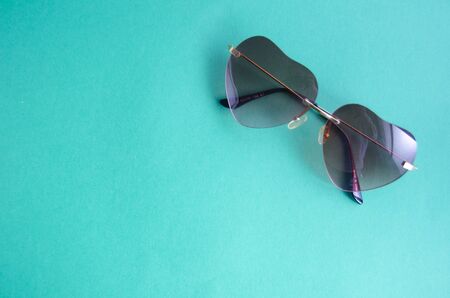 Heart sunglasses on light pink and light blue top view. Girly summer accessory flat lay. Pastel Minimal