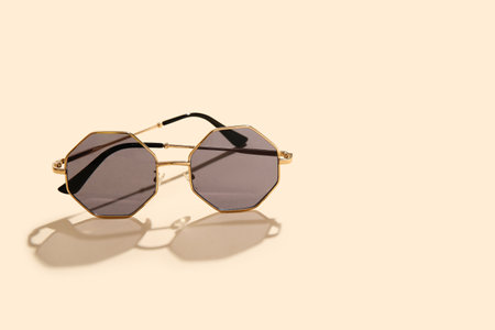 A pair of stylish sunglasses lie on a surface, surrounded by small, geometric shapes. The sunglasses have a gold frame and black lenses, and the shapes are a mix of black and gold.