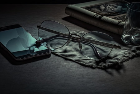 Selective focus of glasses, smartphone on black background and copy space with light and shadow