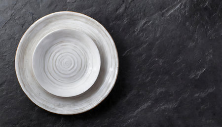 Porcelain empty white plate set with copy space for text or food with copy space for text or food, top view flat lay, on black dark stone table background