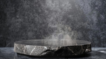 Stone curl color white and gray platter on conrete table, top view mockup. Plate Diy made of cement streaks, scratches and cracks. Space for text. Selective soft focus.