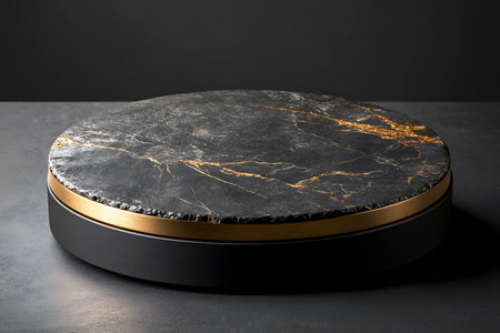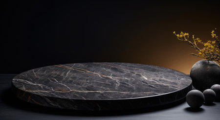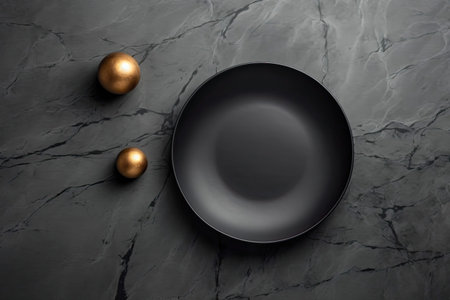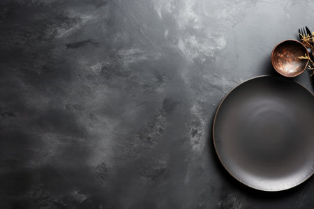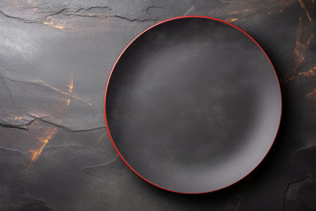 Black plate on dark stone table top view. Empty space for menu or recipe.