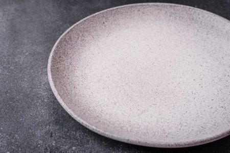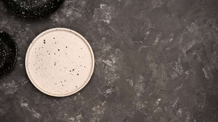 Empty round ceramic plate as an item of kitchen utensils on a textured concrete background