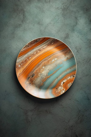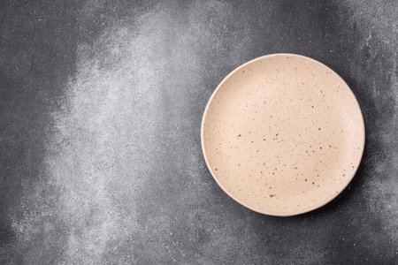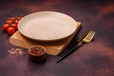 Empty brown colored ceramic plate on dark textured concrete background. kitchen utensils