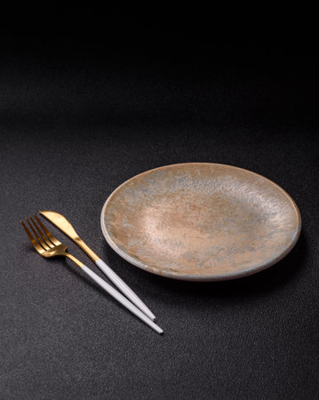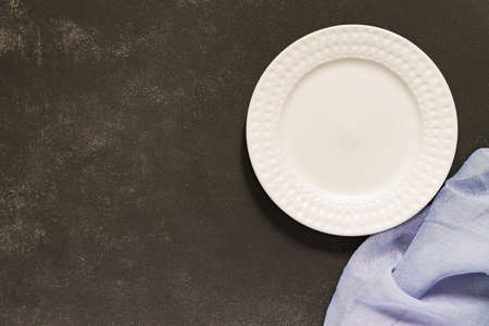 Empty ceramic plate on a dark textured background. Preparing kitchen utensils for a family dinner