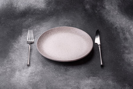 Empty ceramic round plate on dark textured concrete background. Cutlery, preparation for dinner