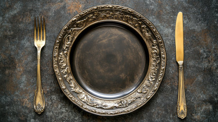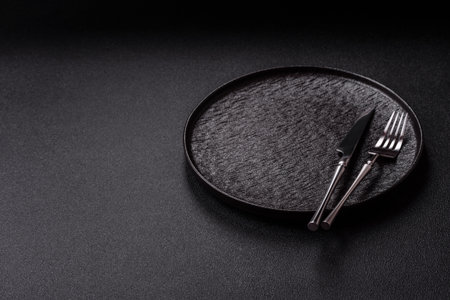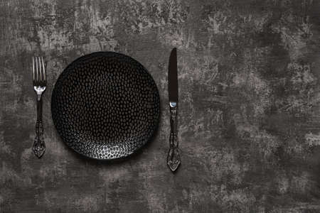 Set table. Black dinner plate, table knife and fork over dark textured surface. Empty porcelain plate near elegant vintage knife and fork for food design. Modern crockery and cutlery. Copy space. Top view.