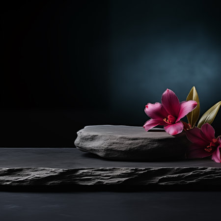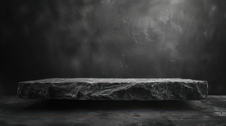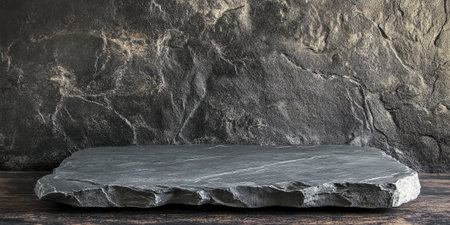 Textured dark slate rocks are arranged in layers, reflecting soft light creating a serene ambiance.