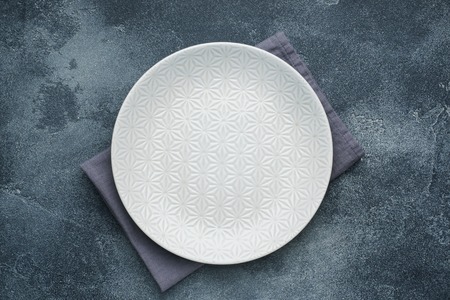 Food background. White empty plate, napkin on stone gray background. Top view, flatlay, copyspace.
