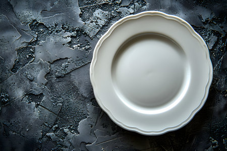 Minimal dining table background with empty white ceramic plate mockup on stylish grunge dark grey background. top view