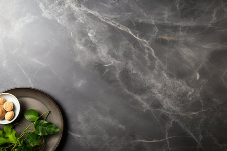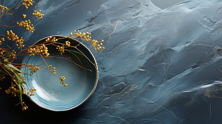 Black smooth background of natural slate with branches of tamarix and blue ornated plate on it. Texture of stone closeup. Graphite backdrop