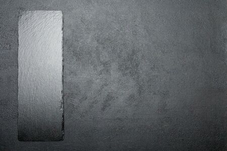 Black slate board on a dark stone texture. Empty space for the menu. The concept of a culinary recipe. The ability to copy. Flat panoramic layout, panoramic view from above.
