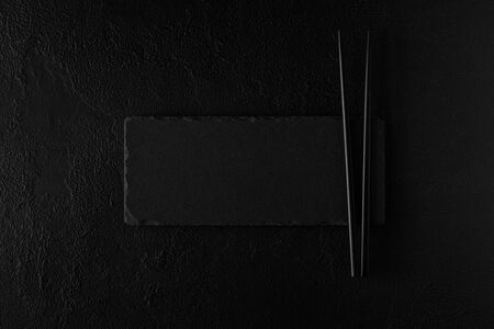 Empty black slate plate with chopstick on dark Background. Flat Lay. Top view. Mock-up